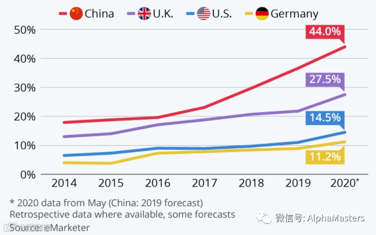 中国电商渗透率远远高于海外,在阿里京东等电商推动和完善的电商基础设施环境下,中国人已经是全球电商购物习惯最强的群体。