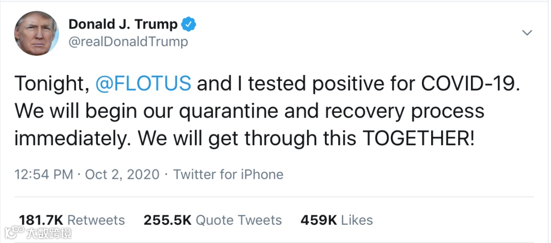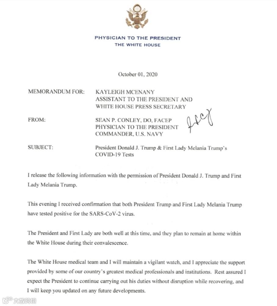 白宫医生也发表声明,特朗普及妻子感染新冠,不过情况良好,将在白宫隔离治疗并履行职责: