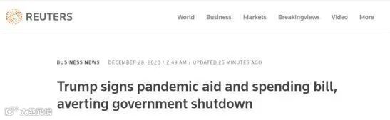 这份总额超过2.3万亿美元的法案中,9000亿美元是关于新冠纾困的,其中包括了给收入不超过7.5万美元的美国人发钱600美元。法案还包括了新财年预算,特朗普的签署避免了联邦政府在年底前被迫关门的窘境。