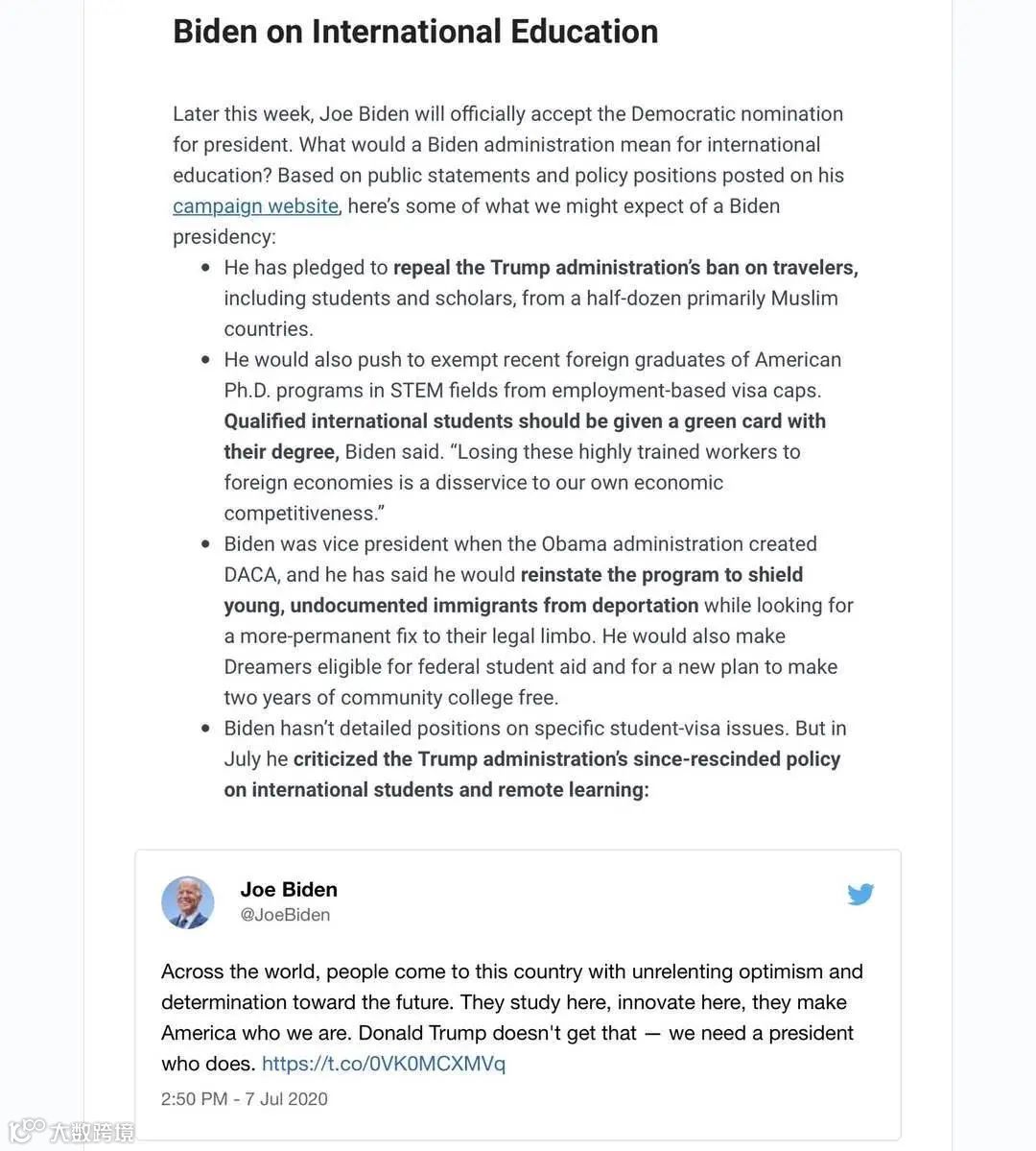 对留学生也是如此,虽然不会出台什么鼓励政策,但至少不会更坏了...民主党一向对国际教育交流持支持态度,之前拜登也表示将确保美国继续吸引世界上最优秀和最聪明的人。