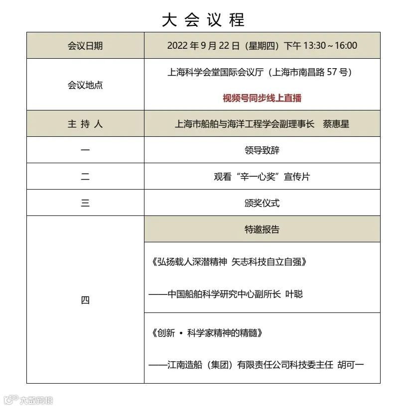 上海市船舶与海洋工程学会兹定于2022年9月22日(星期四)下午13:30在上海科学会堂国际会议厅隆重举办“弘扬科学家精神,推动高水平科技自立自强报告会暨第四届‘辛一心船舶与海洋工程科技创新奖’颁奖大会”。会议邀请有关上级主管部门、学会领导、各届获奖者以及来自船海行业相关研究设计院所、高校、造修船企业以及配套企业等单位的科技工作者参会。