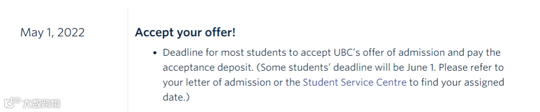 UBC:5月1日,大多数学生接受录取通知书并支付录取押金的截止日期。(有些学生的截止日期是6月1日)