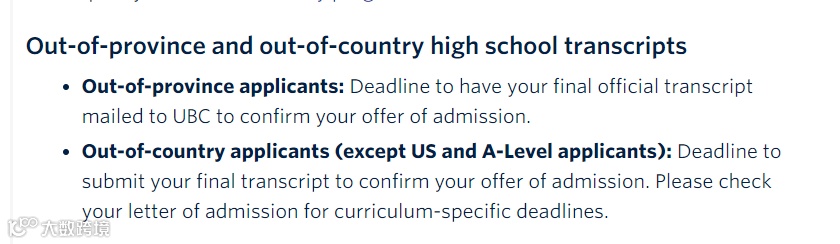 UBC:7月25日,国外申请者(美国和 A-Level 申请者除外)提交最终成绩单以确认录取通知书的截止日期。