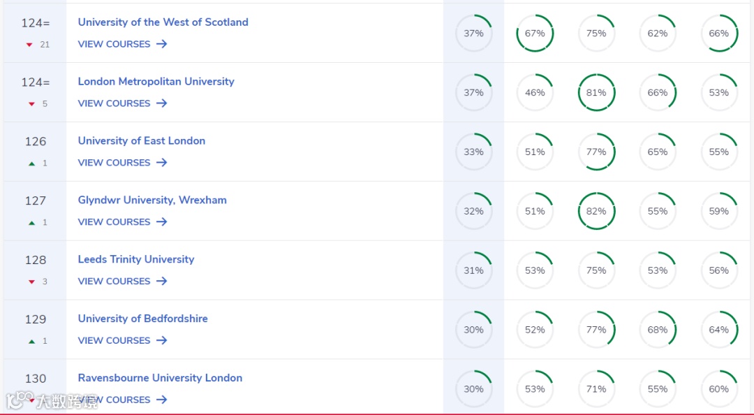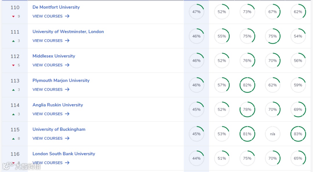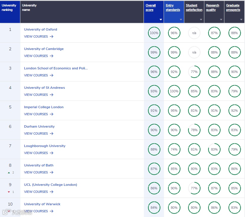 帝国理工学院相对去年上升了一名,排名第5;而杜伦大学则相对去年下降了一名,排名第6。