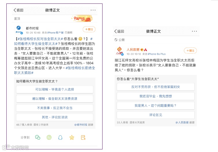 后来逐渐演变成对于“全职太太”这个话题的全民讨论,比如“女大学生当全职太太是对教育资源的浪费吗?”、“你能接受女大学生当全职太太吗”......