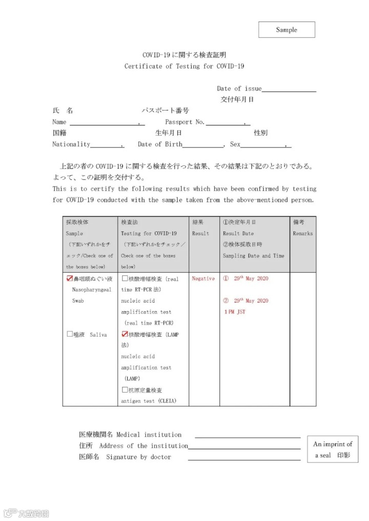 需要登机前72小时之内发行的PCR检测证明书,原则上必须使用从外务省官网下载的表格,并由当地医疗机构填写并盖章,所有内容均需用由英文填写或附英文翻译。