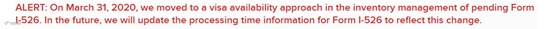 自2020年3月31日起,EB-5投资移民的I-526审批规则,已从先进先出,变更为根据排期(签证)情况进行审批(visaavailability approach (VAA)),即没有排期或即将有签证可以分配的国家优先审批。新的I-526审案规则并非会对所有中国大陆EB-5申请人产生影响。