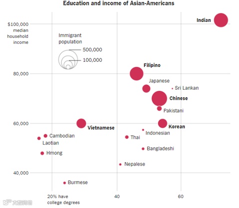 在亚裔中,印度裔家庭中线收入比华裔多出了30000美元,可谓是遥遥领先。
