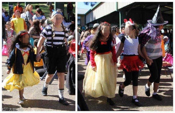 下图是故事人物大游行(book character parade),许多装扮行头都是孩子们自己设计制作的: