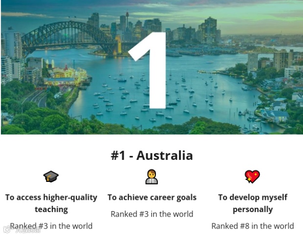 从这份榜单中,我们可以看到英美留学国家处于榜单前列,而澳大利亚从去年的世界第二名一跃升到了全世界最受留学生欢迎国家TOP 1的位置。