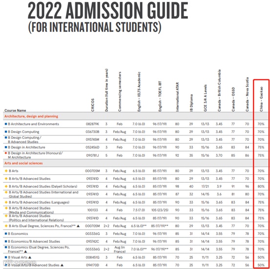 大部分专业要求高考成绩达到总分的70%-75%,这些专业包括一些商科、建筑设计、环境管理、计算机科学、商科等等,例如: