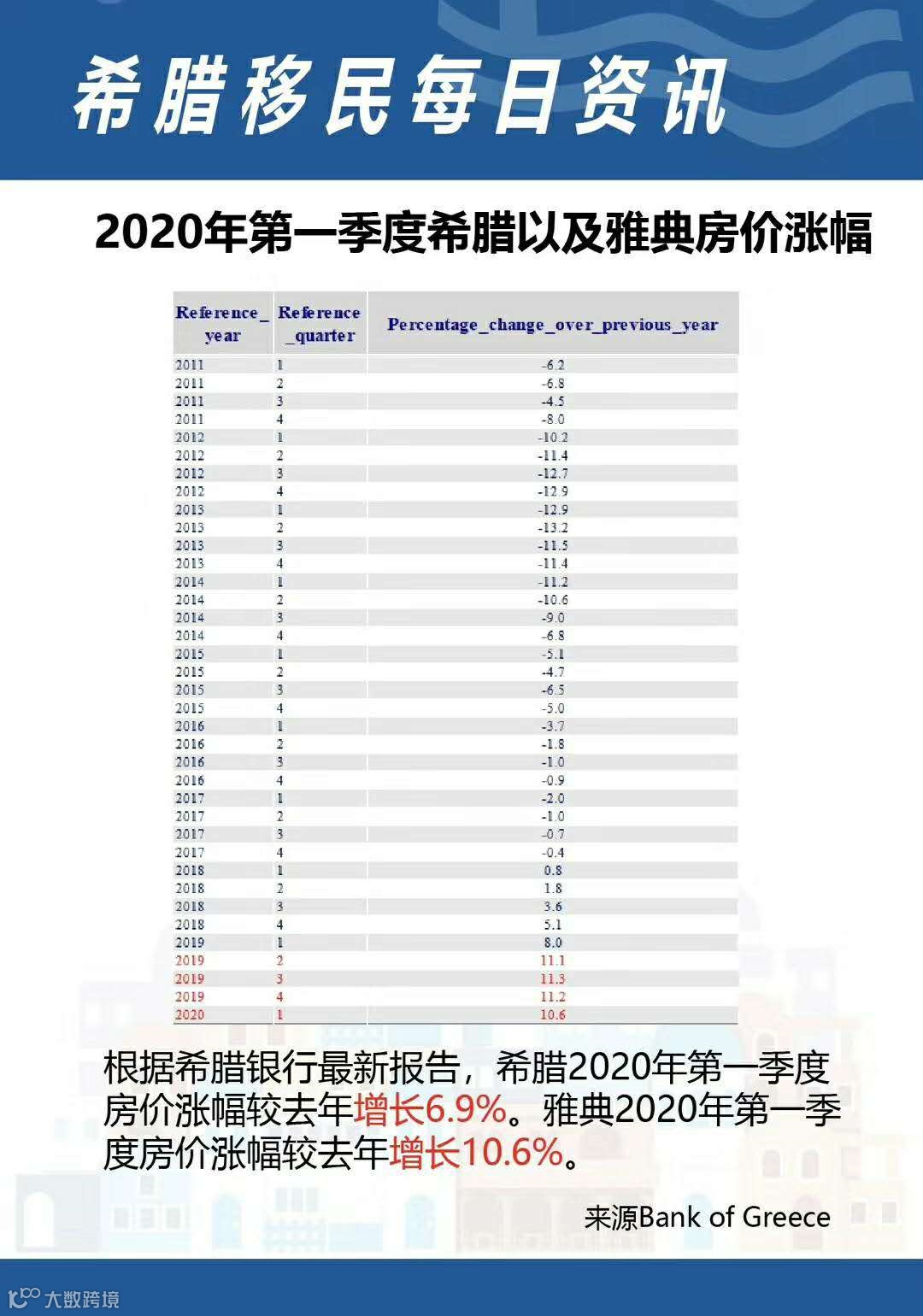 希腊整体房价连年上涨,据希腊银行(央行)最新数据报告显示,雅典的房价在2019年涨幅维持在10%+,2020年第一季度较去年增长10.6%。整个希腊在2020年第一季度,房价涨幅较去年同期增长6.9%。
