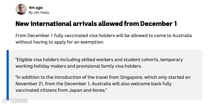 “除了从11月21日开始允许从新加坡入境的旅客外,从12月1日开始,澳大利亚还将欢迎日本和韩国全面接种疫苗的旅客入境。”