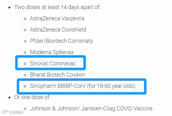 注意这里说的是需要接种TGA认可疫苗的人群,目前TGA认可的疫苗如下,中国生产的疫苗目前承认的是科兴和18-60岁接种了国药的人(北京生物制药研发)。