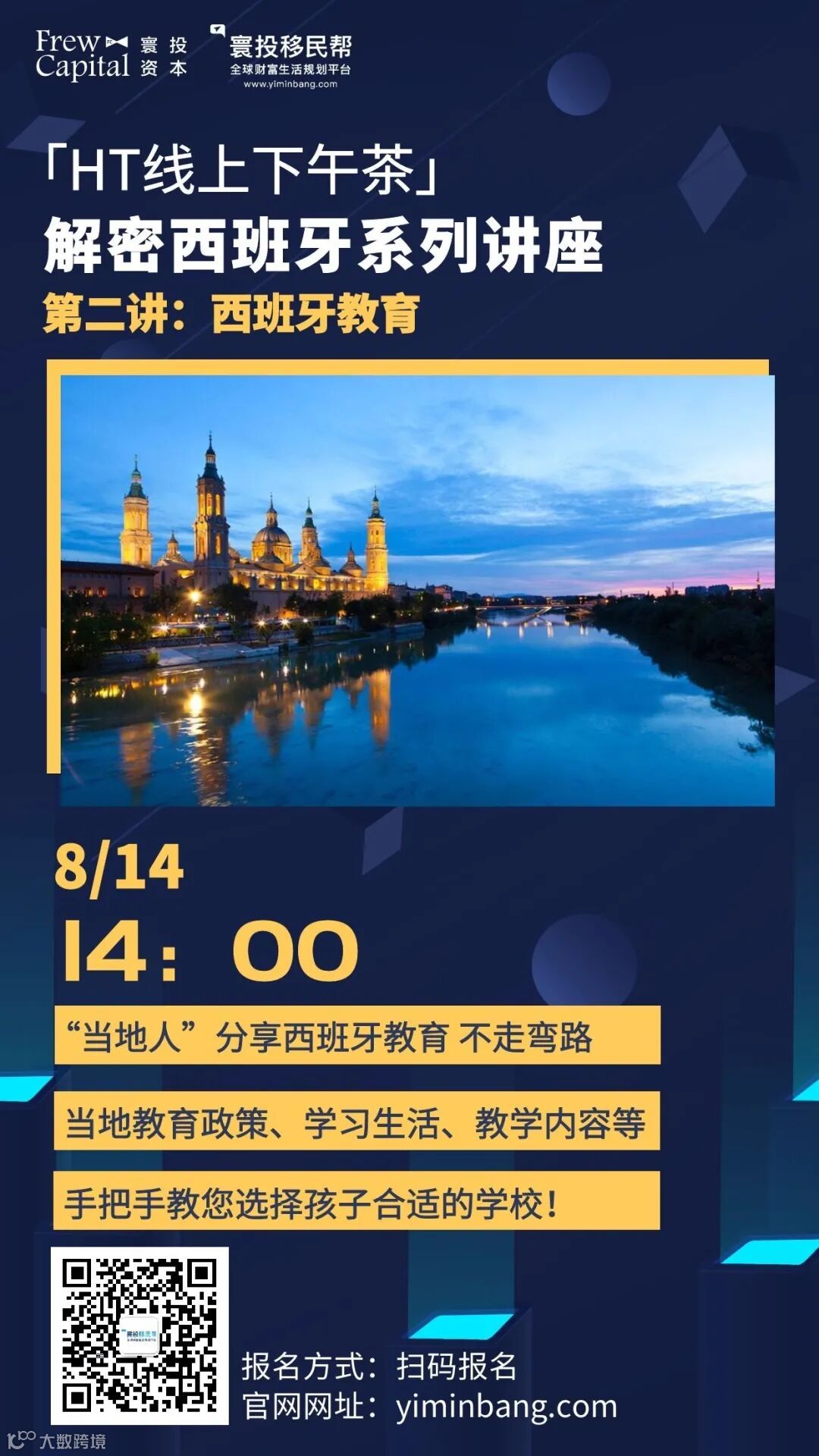 那么,西班牙教育到底怎么样?教育政策是什么样的?日常都有哪些教学内容?移民到西班牙的家庭对教育是否适应?8月14日(周五)下午2:00,寰投移民帮第66期HT下午茶“解密西班牙系列讲座 ——西班牙教育”,欢迎扫码报名!本期特别邀请了长期定居西班牙的同事,分享当地的教育情况,教您挑选适合孩子的学校,期待您的参与!