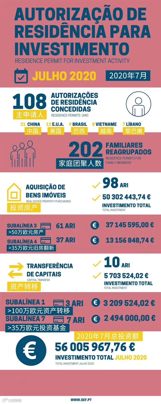 近日,葡萄牙移民局发布了7月份的黄金签证数据:2020年7月共计108位主申请人和202位附属申请人获批葡萄牙黄金签证,投资额为5600万欧元。其中,中国人仍稳居第一名。