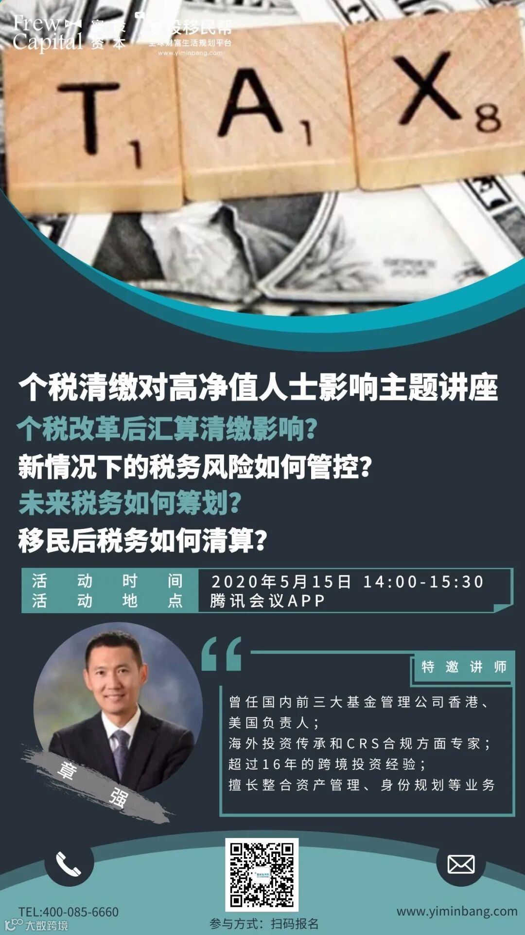 为了帮助大家顺利进行首次汇算清缴,5月15日(本周五)14:00-15:30,寰投移民帮税务专家章强先生将进行《个税清缴对高净值人士的影响》主题讲座。