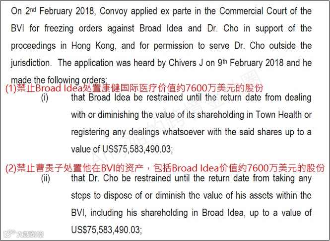 对于禁令1——禁止BVI公司(Broad Idea)处置其拥有的康健国际医疗18.85%的股份,东加勒比最高法院表示同意,并于2018年2月9日发布针对BVI公司的冻结令。