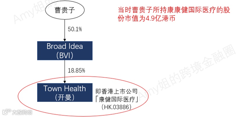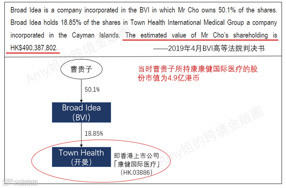 持股方式上,曹贵子通过一间BVI公司Broad Idea(持其50.1%股份),最终持有开曼公司Town Health(即康健国际医疗)18.85%的股份,这18.85%的股份,也是曹贵子的主要财产之一。