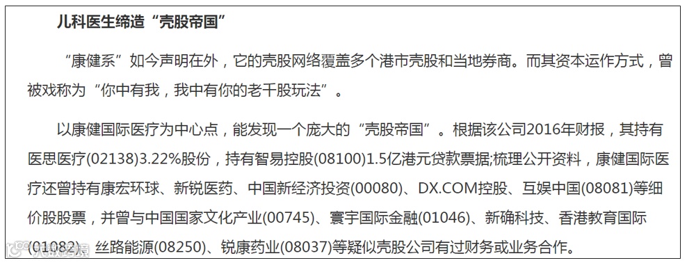 有人称,在这个“壳股帝国”里,康健国际医疗和“康健系”就是“壳中心”。