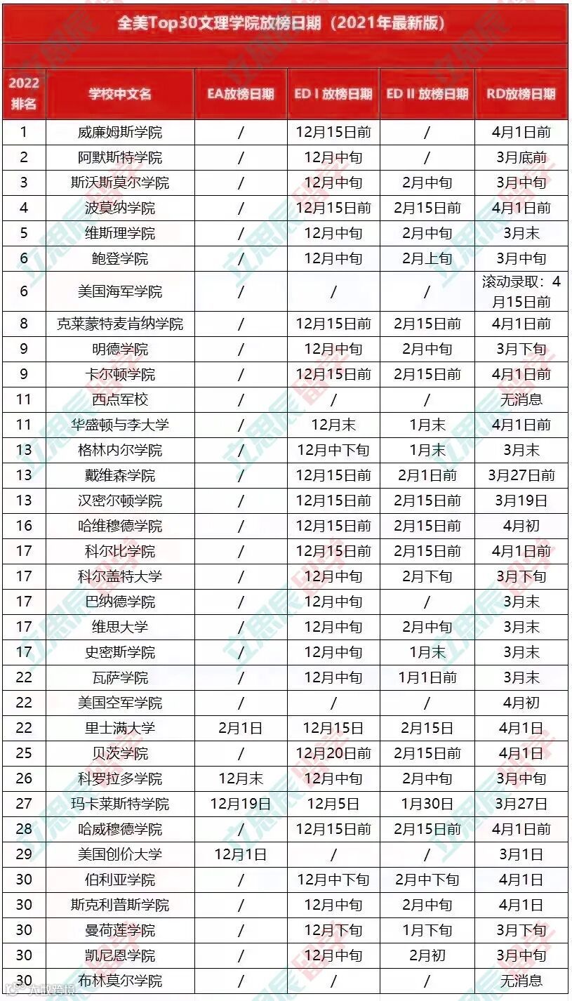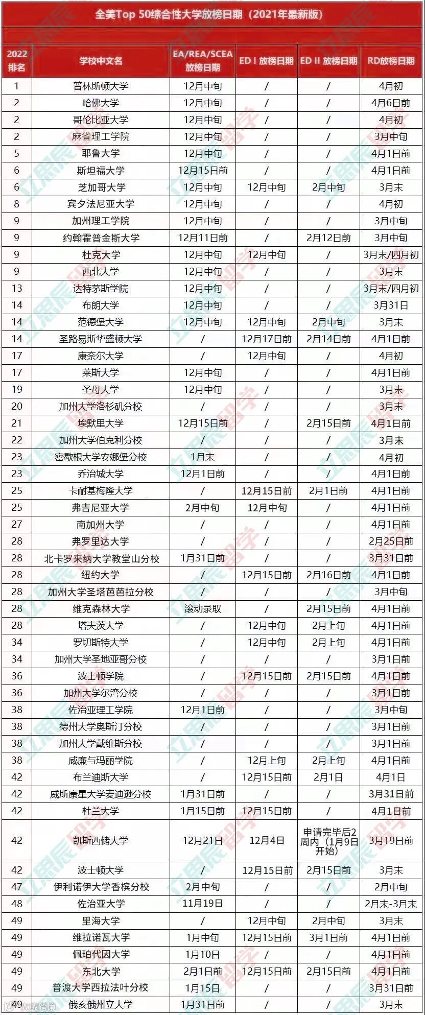 为了帮助申请季的同学们合理安排时间,小编给大家汇总了TOP50大U&TOP30文理学院EA/ED/ED1放榜日期供大家参考!