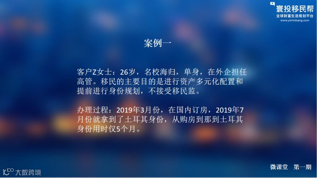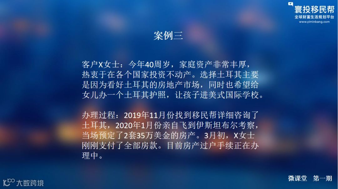 第一位客户Z女士今年26岁,是名校海归,目前在外企担任高管,出于资产多元化配置和身份规划的需要,她决定办理25万美元土耳其购房移民的项目,对比了多家移民公司之后。Z女士认为我们移民帮的顾问非常专业,并且也非常认可我们的服务,所以就选择了我们。