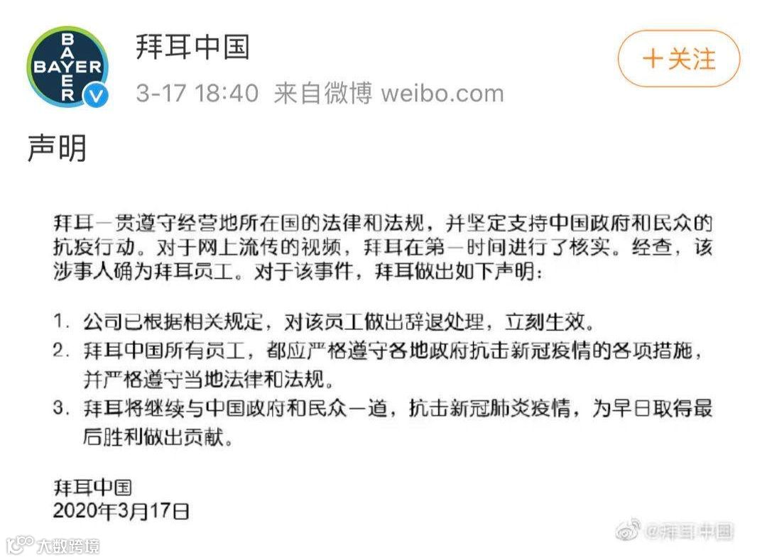此举一经曝光,引发广大网友义愤填膺。经调查,该女子是拜耳集团的员工,就在刚刚,拜耳发布声明,将其辞退。