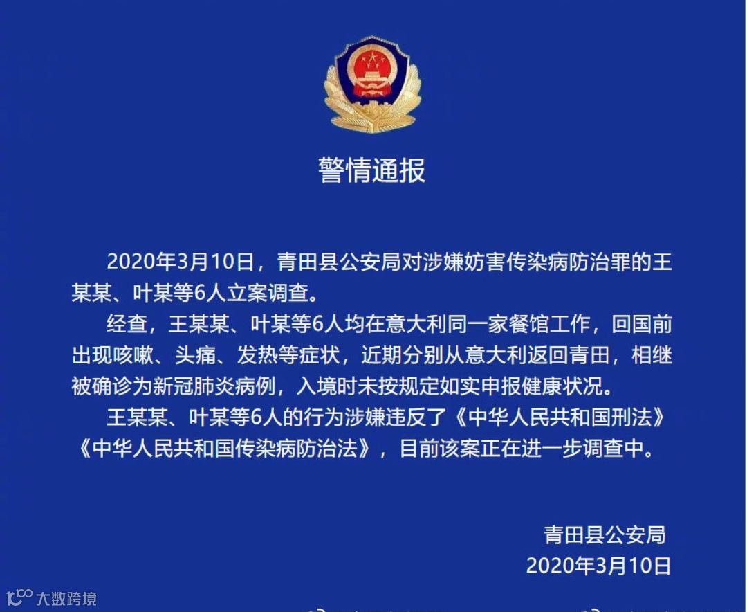 目前,青田县公安局已正式立案,6人涉嫌违反刑法及传染病防治法。