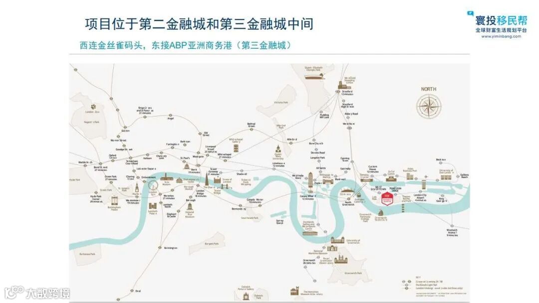 地图上项目的位置,在它图中标红的RW logo 的地方,项目的左边和对面是著名的格林威治区域,里面有O2场馆,是非常大的一个商业综合体。再往左边走是金丝雀码头,那边是伦敦第二金融城。