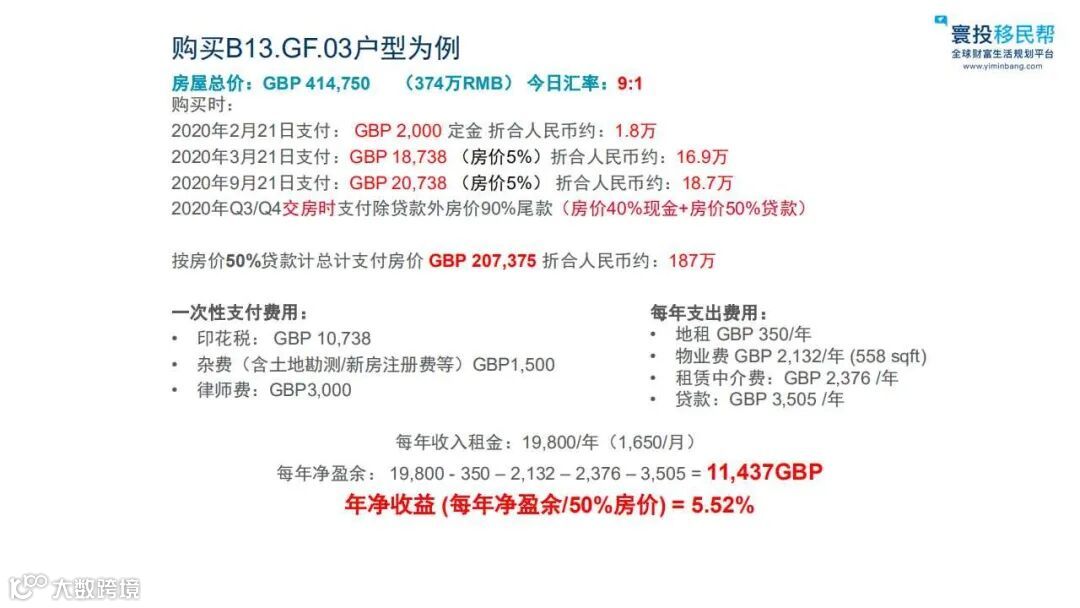 比如2月21日支付2000英镑定金,再过一个月3月21日之前,支付5%的房价减去定金,就是18,738英磅,人民币在17万是非常便宜的。过半年后的9月21日,需支付20,738英镑,人民币19万元。在今年年末交房的时候,要支付90%的尾款。购买这套房产,按房价50%贷款计算需要支付总房款一半,人 民币 是187万。