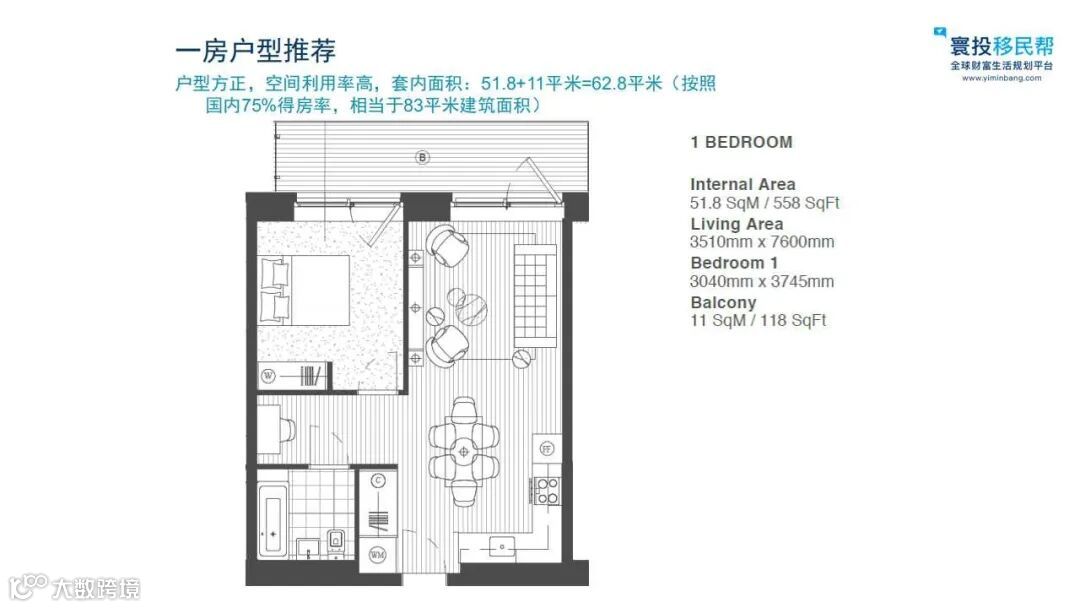 一居室的户型比较方正,该户型利用率很高,可以把客厅隔成第二个房间,把一居室变成两居室去租,收益会更高一点。 整个一居室的户型,套内是51.8平,再加上11平米的平台,因为在一楼,会附赠平台,一共是62.8平米。 在国内相当于83平米。