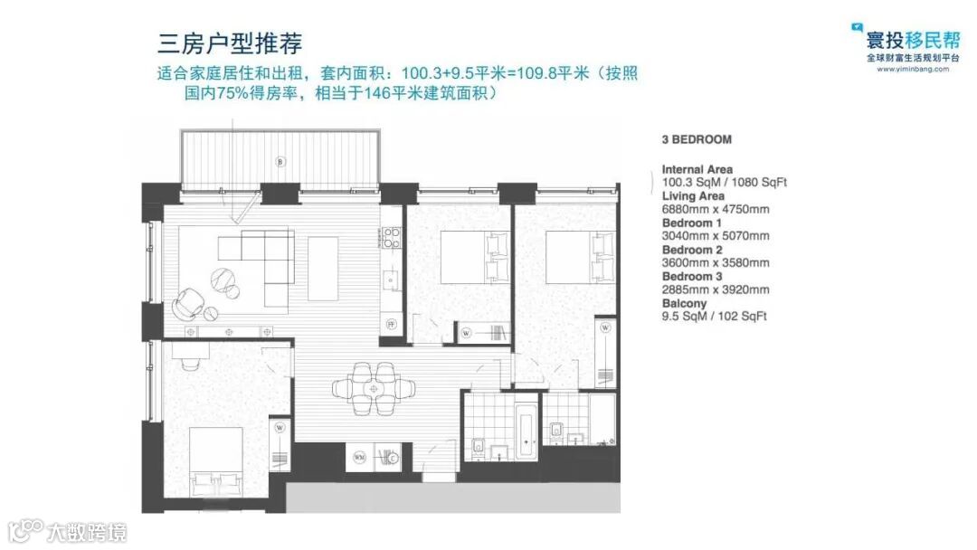 三居室是一个非常适合自住三室两厅两卫的户型, 户型面积是100.3平米,加上平台9.5平米,一共是近110平米,相当于国内146平米。