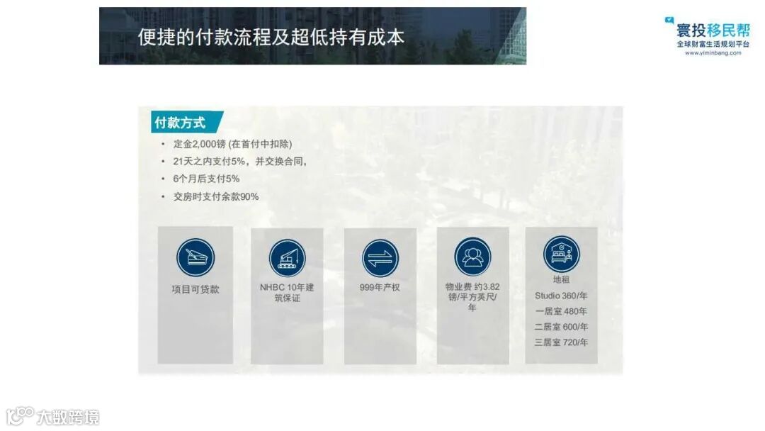 该项目也是可以贷款的,会赠送NHBC10年的外墙保,产权999年,物业费大概在3.82磅每平方英尺每年,拿一居室为例, 物业费不到 2500英镑。