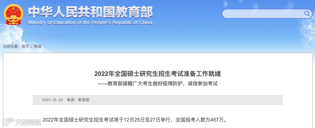 教育部发布《2022年全国硕士研究生招生考试准备工作就绪》,文中提及22考研全国报考人数为457万!