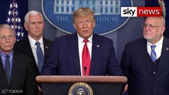 特朗普召开新闻发布会现场,右一为美国疾控中心主任雷德菲尔德