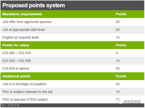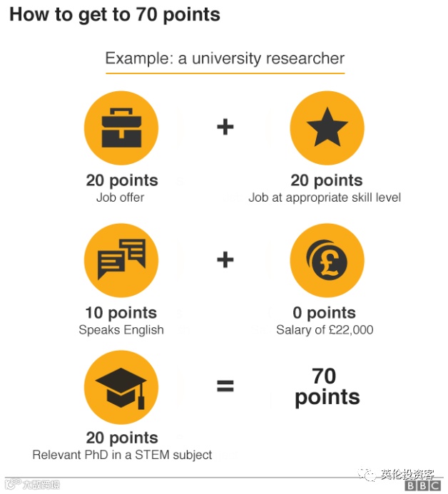 1. Tom是一位数学博士,希望以 £22,000 (低于要求的£25,600)的薪水来英国,虽然薪资不符合要求,但他作为数学博士依然能加20分,以总分70分申请工作签证。