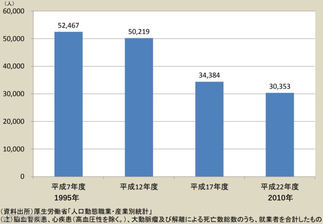 职工因脑血管疾病、心脏病导致的死亡人数从1995年的52467人/年,降低到2010年的30353人/年。