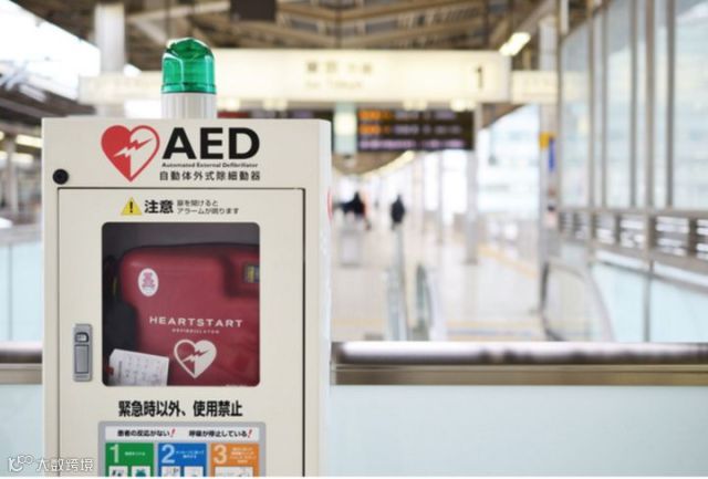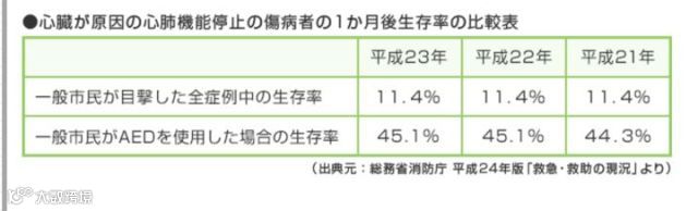 根据日本消防厅的数据,在配备有AED(心脏除颤器)的公共场所,心脏猝死的存活率能从11.4%提高到45%。