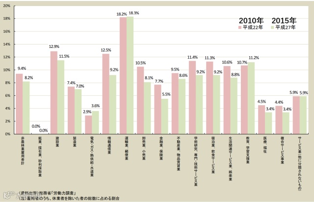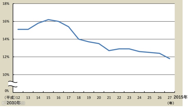 一周工作60个小时以上的员工数占比从2000年的15%,降低到2015年的12%以下。