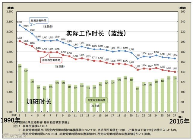 可以看到企业员工的年工作小时数已经从1990年的2064小时,降低到2015年的1734小时,加班小时数也从156小时,降低到132小时。