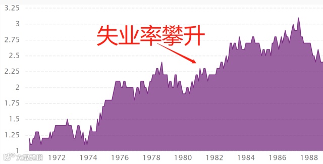 经济的急刹车降低了人们对未来增长的期望值,导致了私人投资的减少,以及企业失业率的上升,日本的失业率从70年代的不到2%,一下攀升到80年代的接近甚至超过3%。