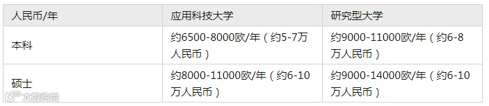 德国16个联邦州除了巴登符腾堡州,其他15个联邦州公立大学免学费。基本上所有学校需在每个学期开始时交纳少量的注册费,注册费的金额为100-250欧元(很多大学的注册费都包含了学生车票,即免费乘坐大学所在地区的交通工具)。德国巴登符腾堡州的公立大学从2017年冬季学期起对非欧盟学生收取每学期1500欧元的学费。
