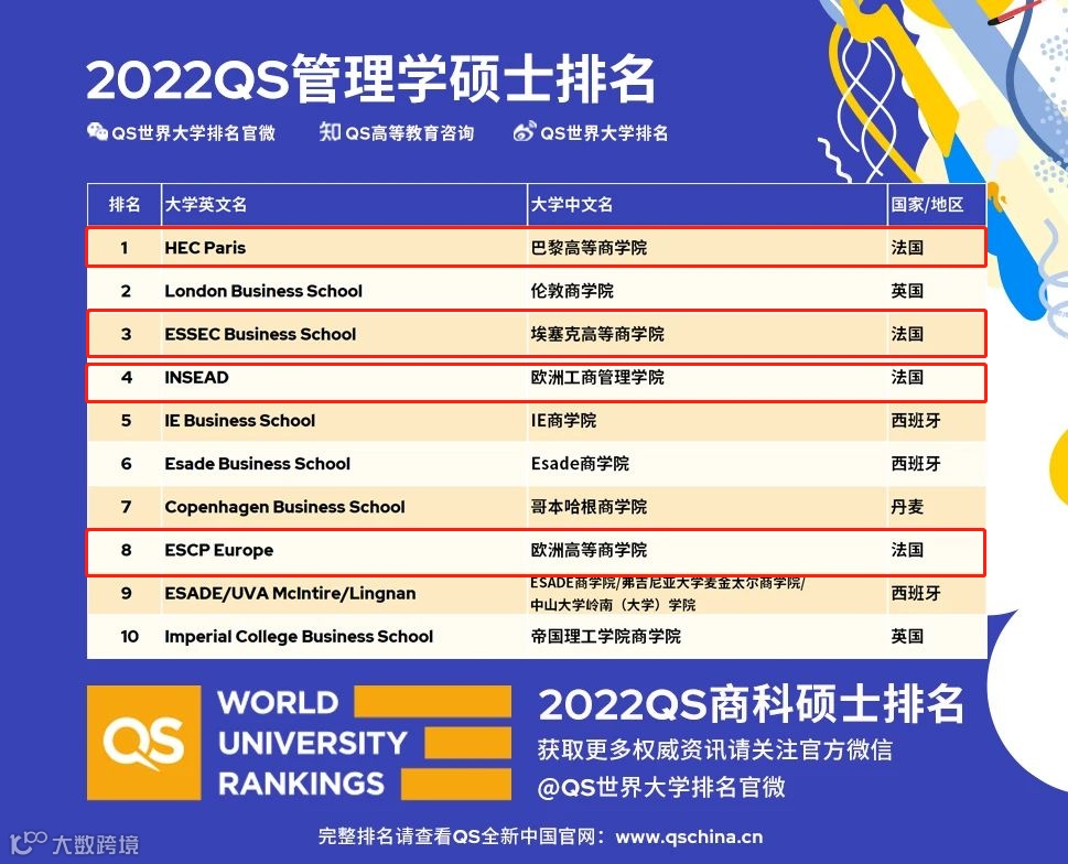 TOP10院校中,ESSEC高商全球第3名,INSEAD高商全球第4名,ESCP高商全球第8名。