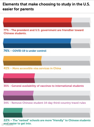 而面对目前出现的困境,留学生家庭不得不权衡一些因素。调查显示,在是否要赴美这个问题上,这些受访者主要关注的是美国政府对中国留学生的态度、美国疫情、美国签证、中国留学生注射疫苗情况等。