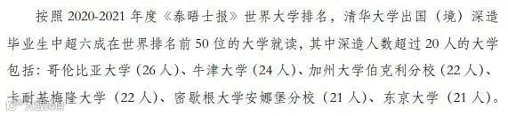 清华毕业生依旧深受国外名校青睐,根据报告数据,6成出国留学毕业生都前往泰晤士排名世界前五十的大学就读,哥伦比亚大学、牛津大学、加州伯克利、CMU、密歇根安娜堡、东京大学这几所世界名校录取人数超过20人。