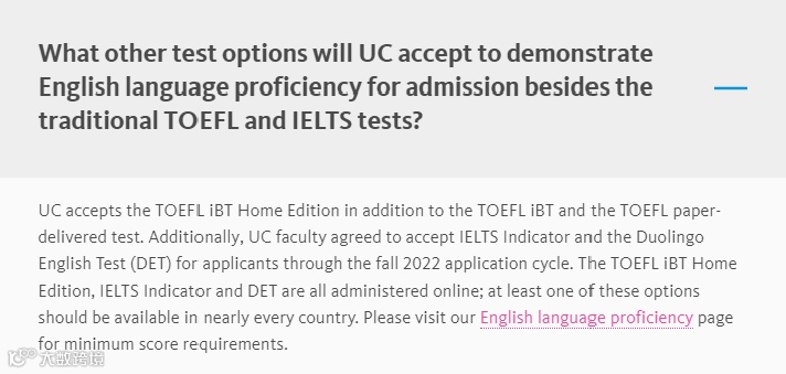 除了TOEFL iBT和TOEFL paper, IELTS外,对于2022年秋季的申请接受IELTS Indicator和Duolingo。