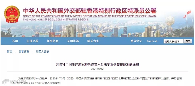 其实,早在3月12日,中国外交部驻香港特派员公署就已经率先宣布,15日起,将对已接种中国生产的新冠疫苗,并持疫苗接种证明材料的多类签证申请人提供便利。