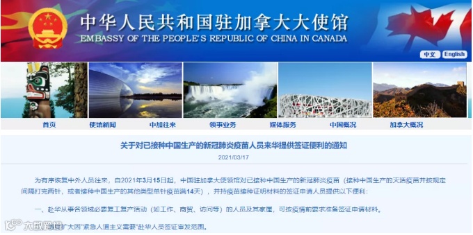 3月17日,中国驻加拿大大使馆发布了《关于对已接种中国生产的新冠肺炎疫苗人员来华提供签证便利的通知》,全文如下: