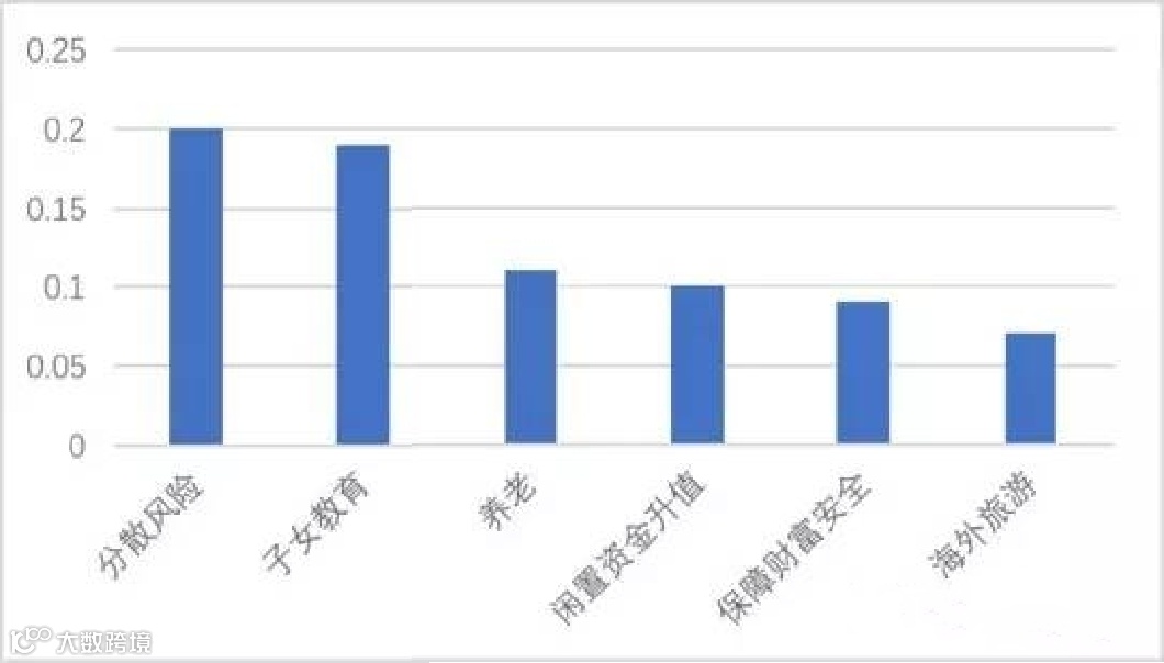 对于高净值人群来说,投资海外的主要目的是为了企业的国际化和个人资产配置分散风险,来分别满足企业和个人财富的双重需要。资产配置分散风险是主要原因,占比20%。子女教育因素紧随其后,占比为19%。由于国内人民币贬值趋势的影响,国内高净值人群更倾向于先让资产保值,将风险降低,在此基础之上,寻求较高的收入。其中,将资产配置分散风险作为主要投资目的的人群最多。