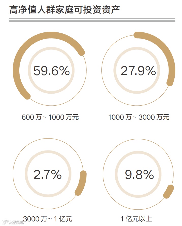 600万~1000万元是达标的门槛,约六成高净值家庭的可投资资产位于这一区间。1000万元以上,则呈现财富量级和人群数量的指数级分布,1000万~3000万元、3000万~1亿元、1亿元以上的比例,分别为27.9%、9.8%和2.7%。